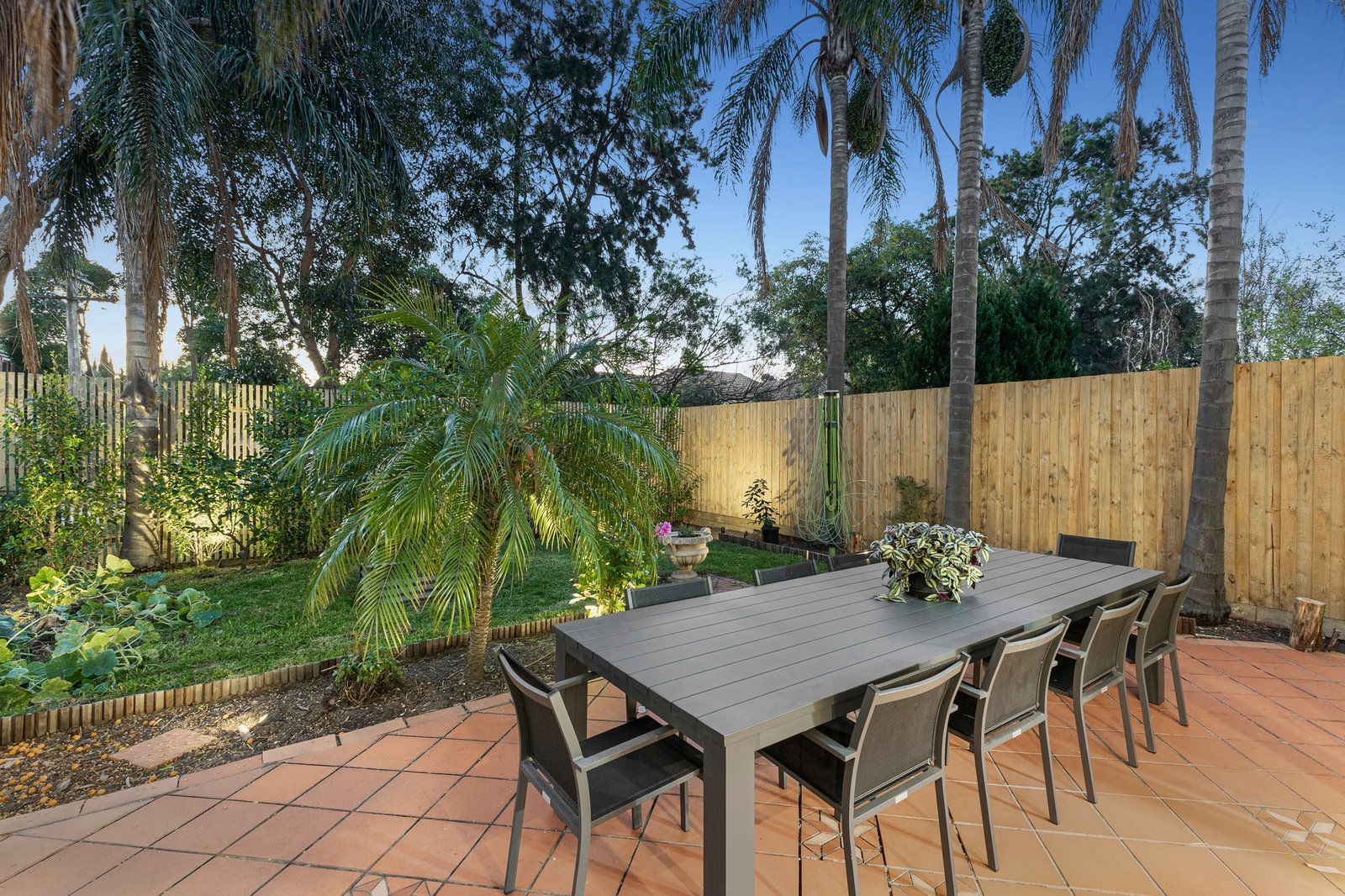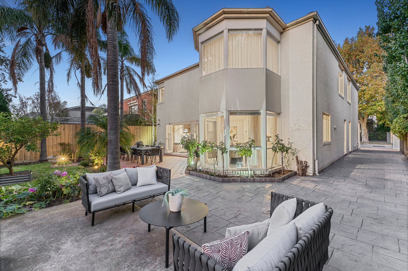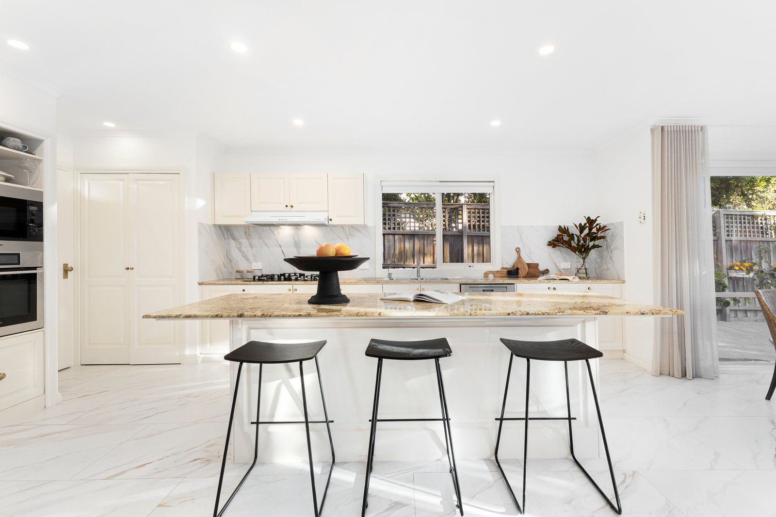 Bi-fold doors extend living outdoors to a sun-filled backyard, where paved areas, established palms and a chef’s garden create a wonderful family environment. Exceptionally private with no overlooking, it’s a haven for al fresco entertaining and children’s play, while a long auto-gated driveway provides parking for four-cars and doubles as the perfect space for a game of cricket.
