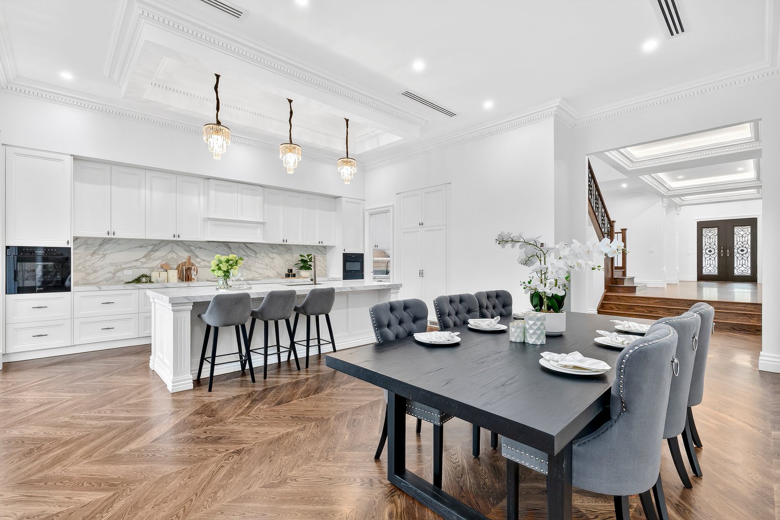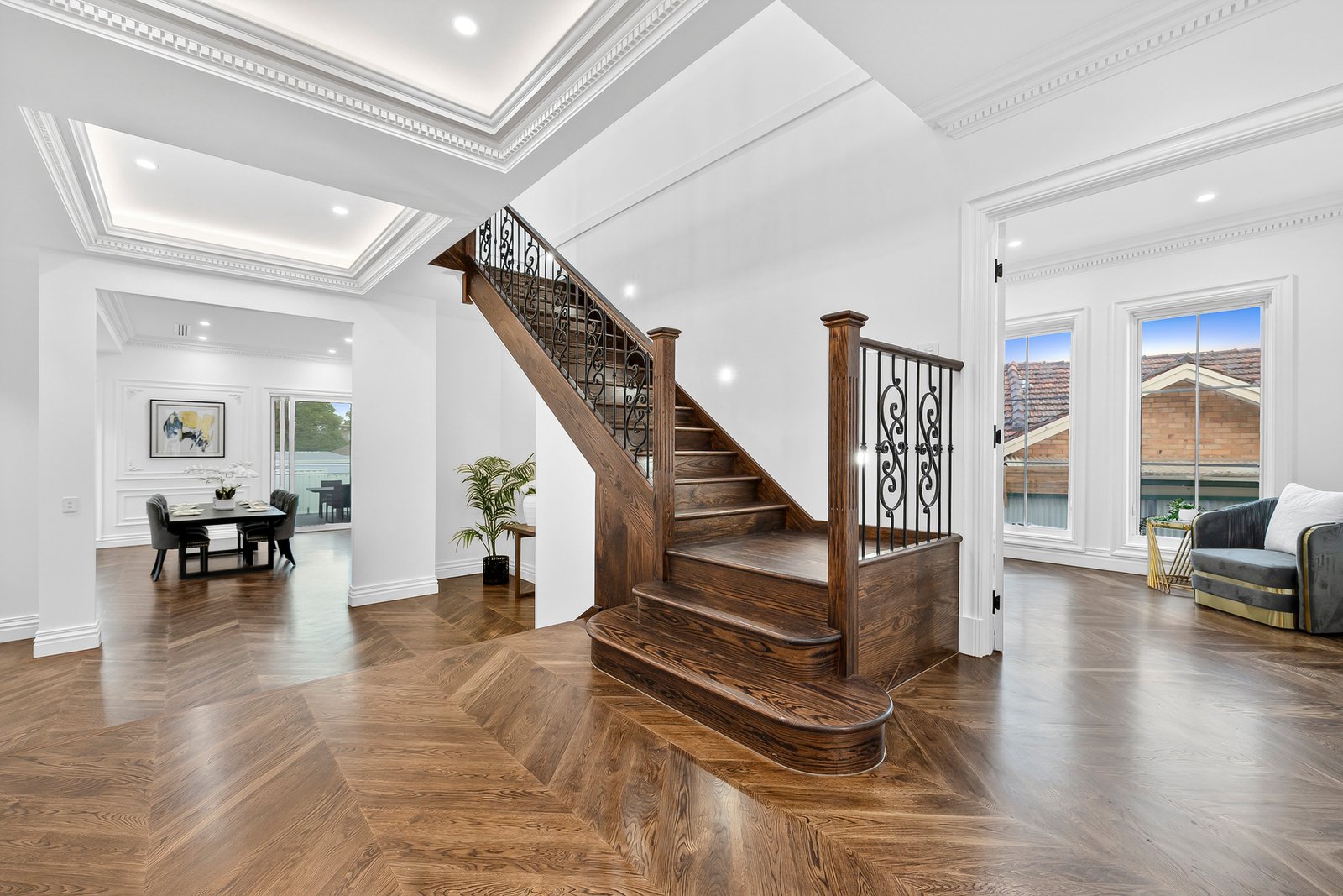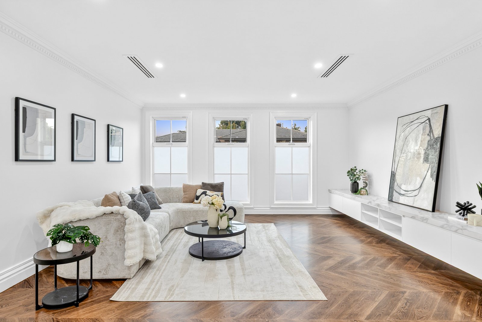 Additional living areas with 3.0-metre ceilings provide versatility for formal entertaining, guest accommodation or quiet retreat spaces, while European oak solid timber flooring laid in a refined chevron parquetry pattern flows through the main living areas, adding warmth and architectural sophistication.