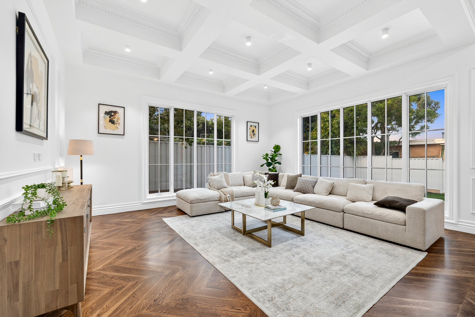 Inside, expansive living, dining and family zones are enhanced by impressive ceiling heights, including soaring 3.5-metre ceilings that create an immediate sense of openness and natural light. This main living area flows seamlessly through double-glazed sliding doors to the alfresco zone, overlooking a generously sized backyard that is ideal for relaxed outdoor living and family enjoyment. Double-glazed windows and doors throughout further enhance comfort, insulation and energy efficiency.