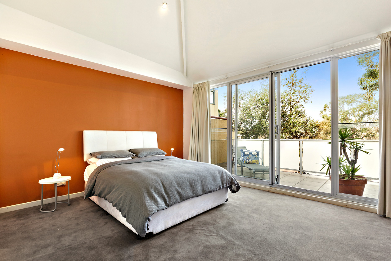 Enter up your own internal staircase to the open plan area living. This living zone area is large and unique with its cathedral style ceiling line adding to the sense of space that opens on to the north west facing balcony with plenty of room for drinks and entertaining. The kitchen is beautifully modern with caesar stone bench tops, stainless steel oven, dishwasher and gas cooktop. Plenty of cupboard and storage space make for a great layout and functional kitchen.