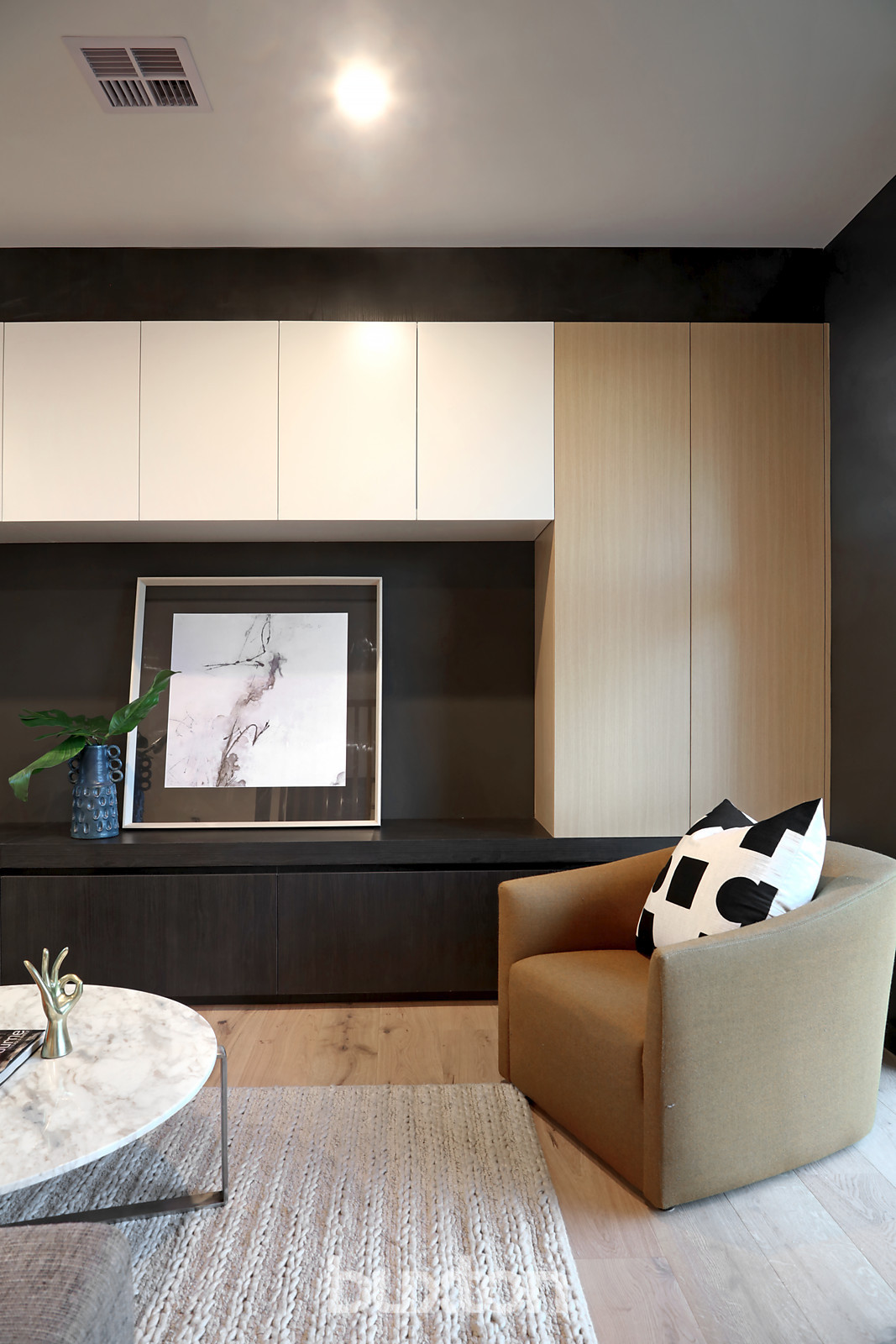 In this future-forward streetfront design, designer lighting sparkles above the dining-table, slatted screening defines living and bespoke joinery extends to extensive media cabinetry. Featuring the latest black tapware and hardware, there are textural sisal-look carpets, shiny mirrored robes...even the discreet laundry is designer-detailed with subway-tiles and stone benchtops. All the prestige appointment are here too - including climate-control over two zones, colour video-intercom and a generous double auto-garage.