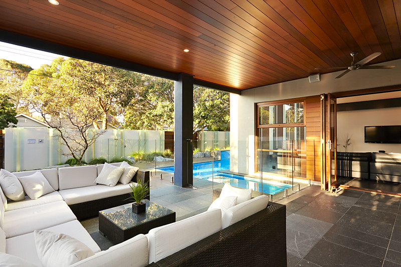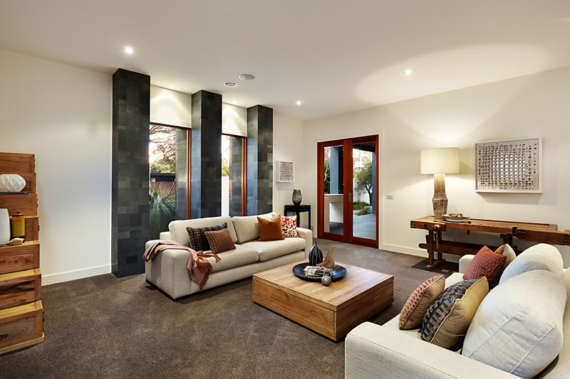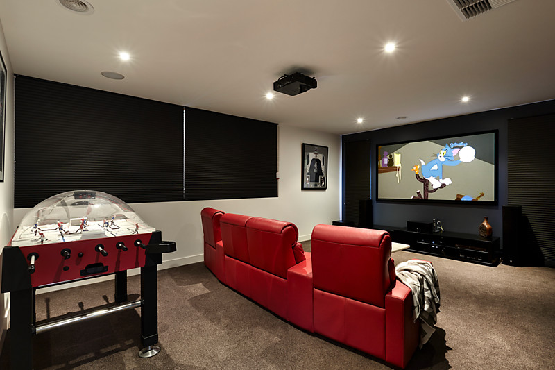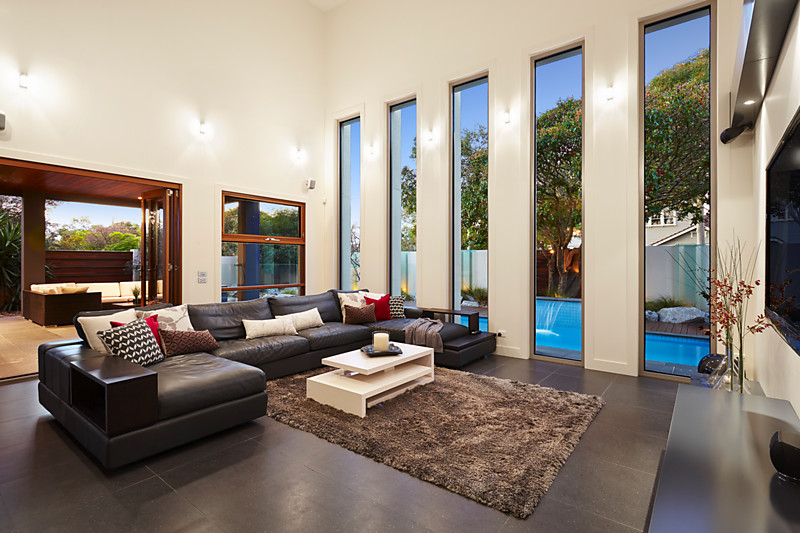 Taking triple zone living to a new level with separate levels to lounge and dine in a spectacular formal zone, and a sun-filled casual area beneath a soaring six metre void, the home steps out through a corner of pillarless bi-folds to a north-facing al fresco area (with CaesarStone BBQ kitchen) and steps up to a fully-wired media lounge in an enclosable mezzanine level.