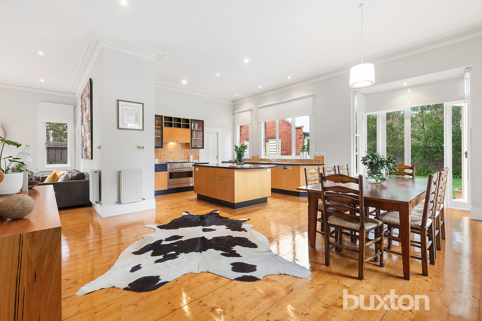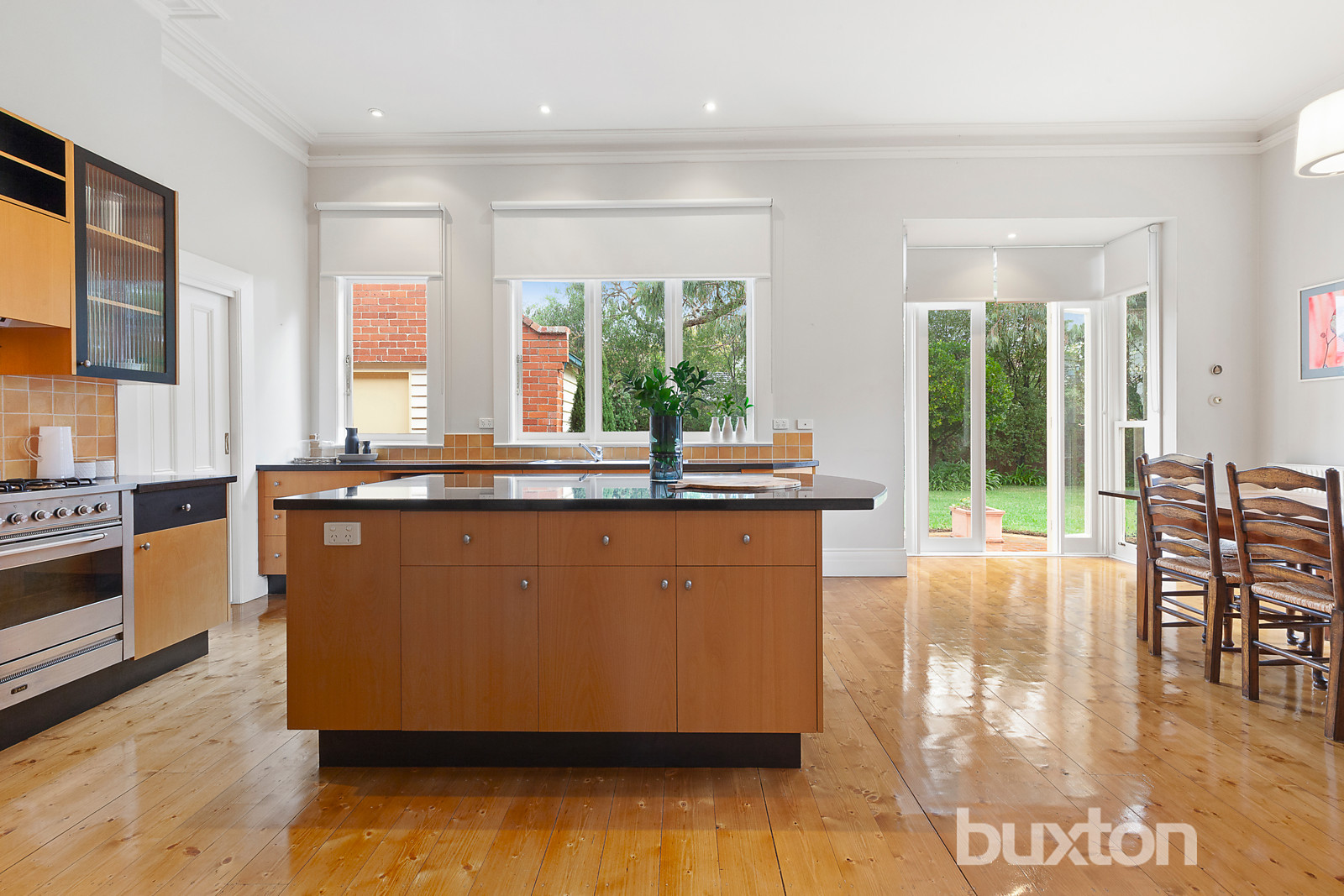 A second north-facing courtyard steps out from light filled, family living while the grand scale kitchen, appointed with granite benches & quality Ilve appliances, and dining area is the heart of the home.