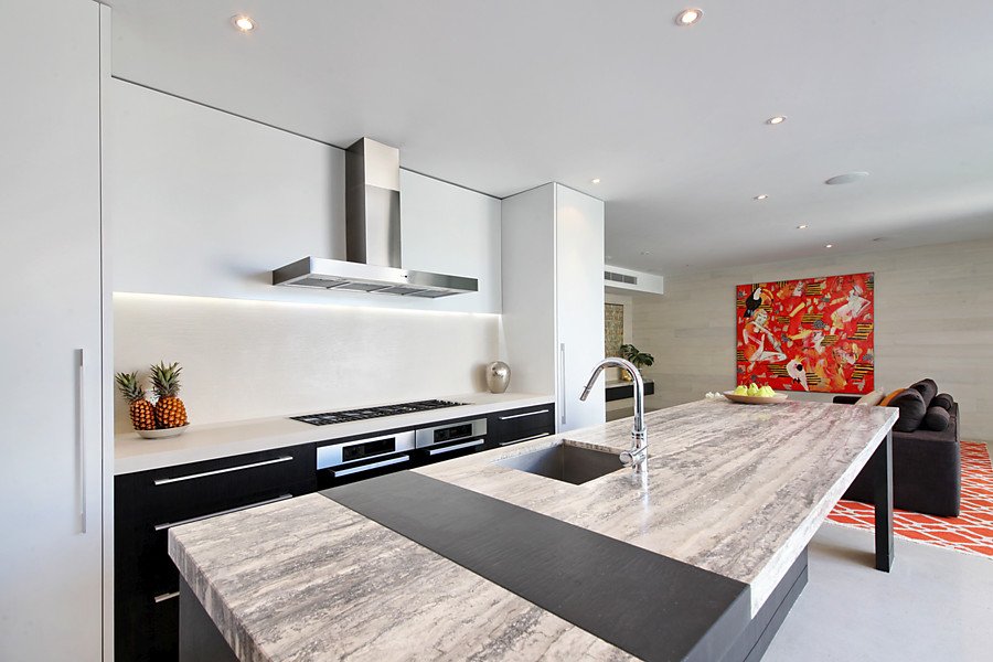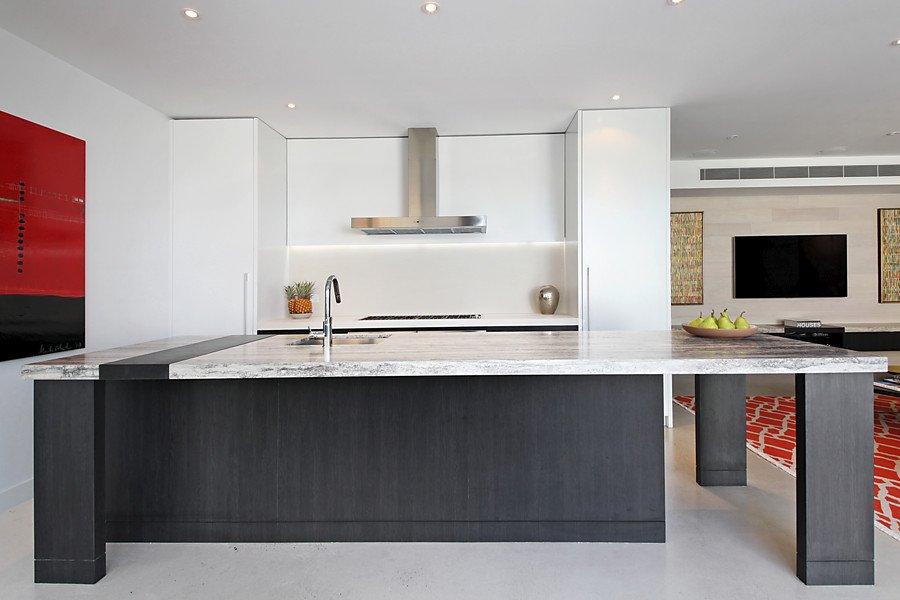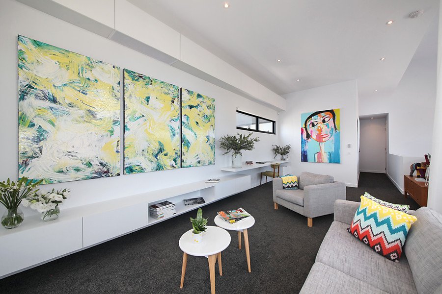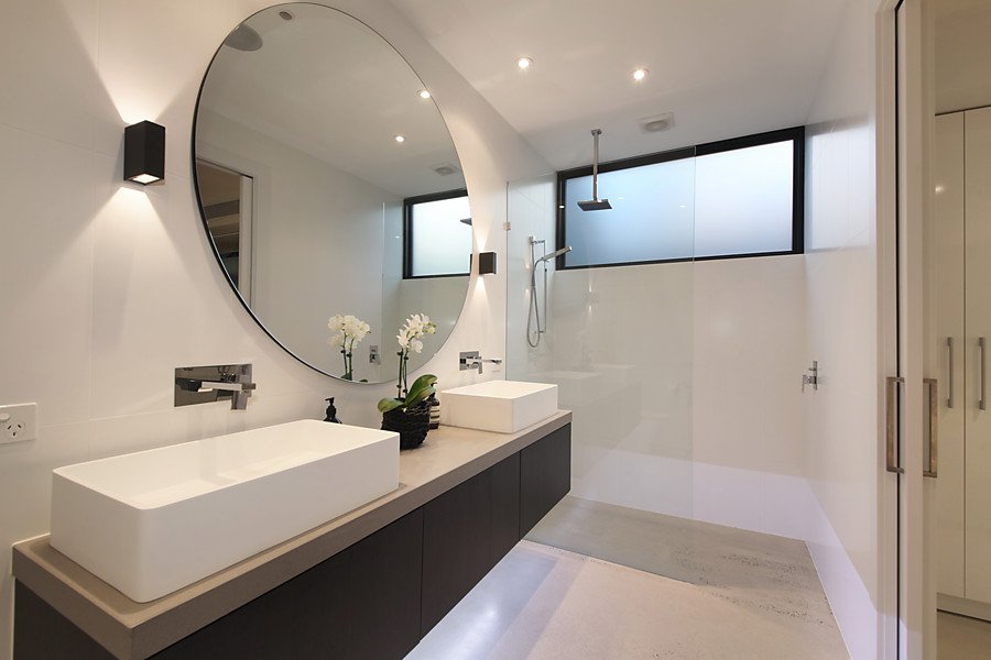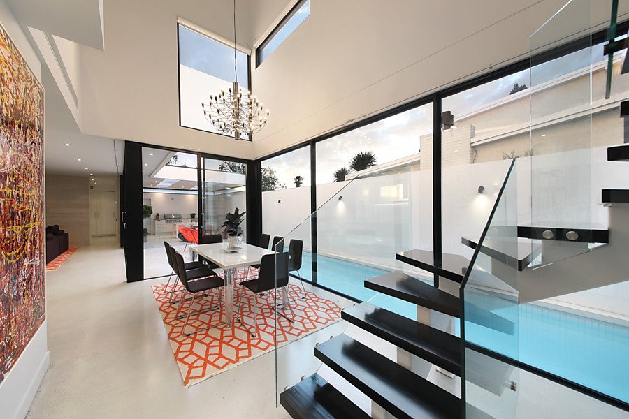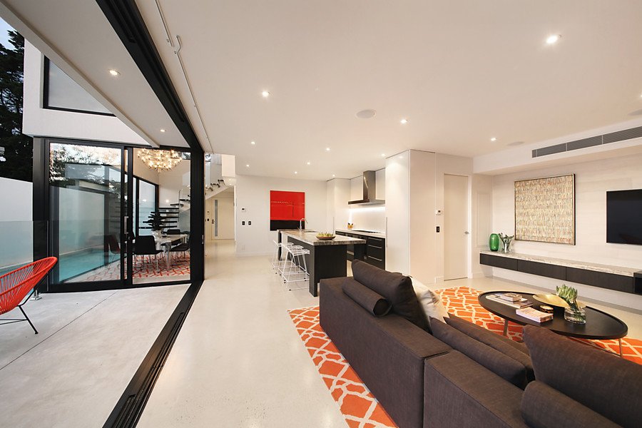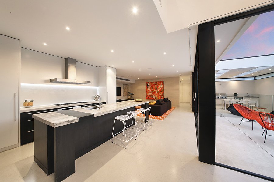 Two streets from the beach, this modern Architect Designed home in conjunction with Black Milk Interior Design is a successful combination of form and function, bringing the expansive living, dining and kitchen space to life with smart and innovative materials such as natural stone bench tops, hydronic slab heated polished concrete floors and double glazed commercial windows.