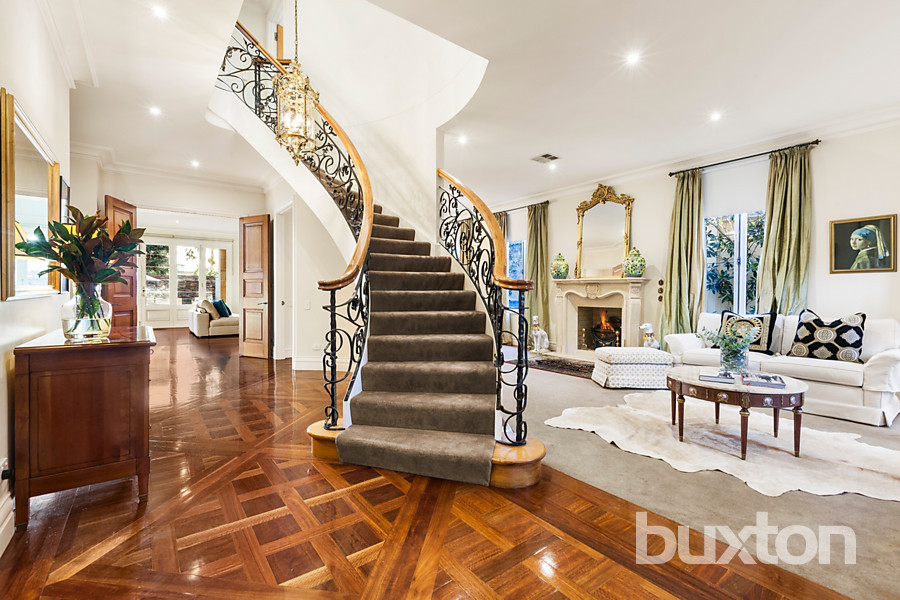 Opening the traditional French style oak doors and entering the impressive foyer complete with a 3m ceiling, solid spotted-gum floors and elegant wrought iron staircase extending up three levels the tone is set for this striking home. Beyond the foyer there's an elegant formal living and dining area featuring a carved limestone gas fireplace, a powder room and incredible open living, dining and kitchen space. And you'll never want to leave the kitchen with its Calacutta benches, Smeg appliances and slide out pantry all facing the beautiful outlook through French doors.