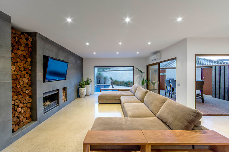 - Formal lounge room offering open fire place, cut Blue Stone feature wall, viewing window to pool and spa & polished concrete flooring